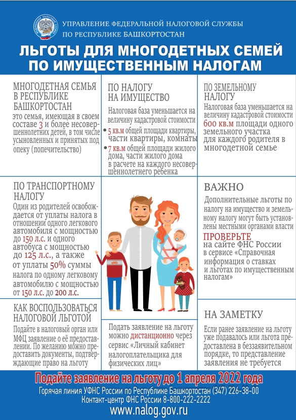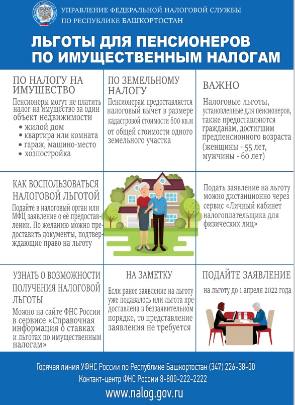 УФНС России по Республике Башкортостан рекомендует гражданам республики, имеющим право на налоговые льготы по имущественным налогам и ранее о них не заявлявшим, подать заявление на льготы до 1 апреля 2022 года.